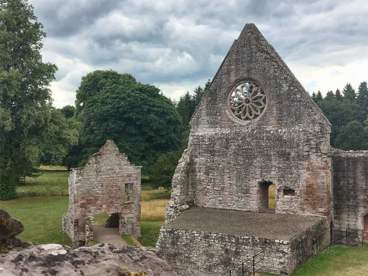 Our most intense day of hiking begins at the Kelso Abbey ruins and ends in Dryburgh. The Abbey fell under the English army in due to Robert the Bruce using it as a base of operations in his Northumberland campaign. Restored, it was burned again sixty years later. It survived as a parish church and gaol for about 200-years until its final destruction under the Scottish Reformation. - Day 8 – Dryburgh to Melrose